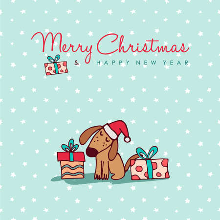 メリー クリスマス新年あけまして手描き犬グリーティング カード イラスト面白い子犬ギフト ボックスと手書き休日タイポグラフィ引用のサンタ帽子 の イラスト素材 ベクタ Image